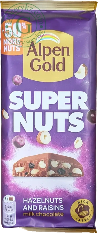 - Alpen Gold Super Nuts milk chocolate with hazelnut and raisins, 120 g